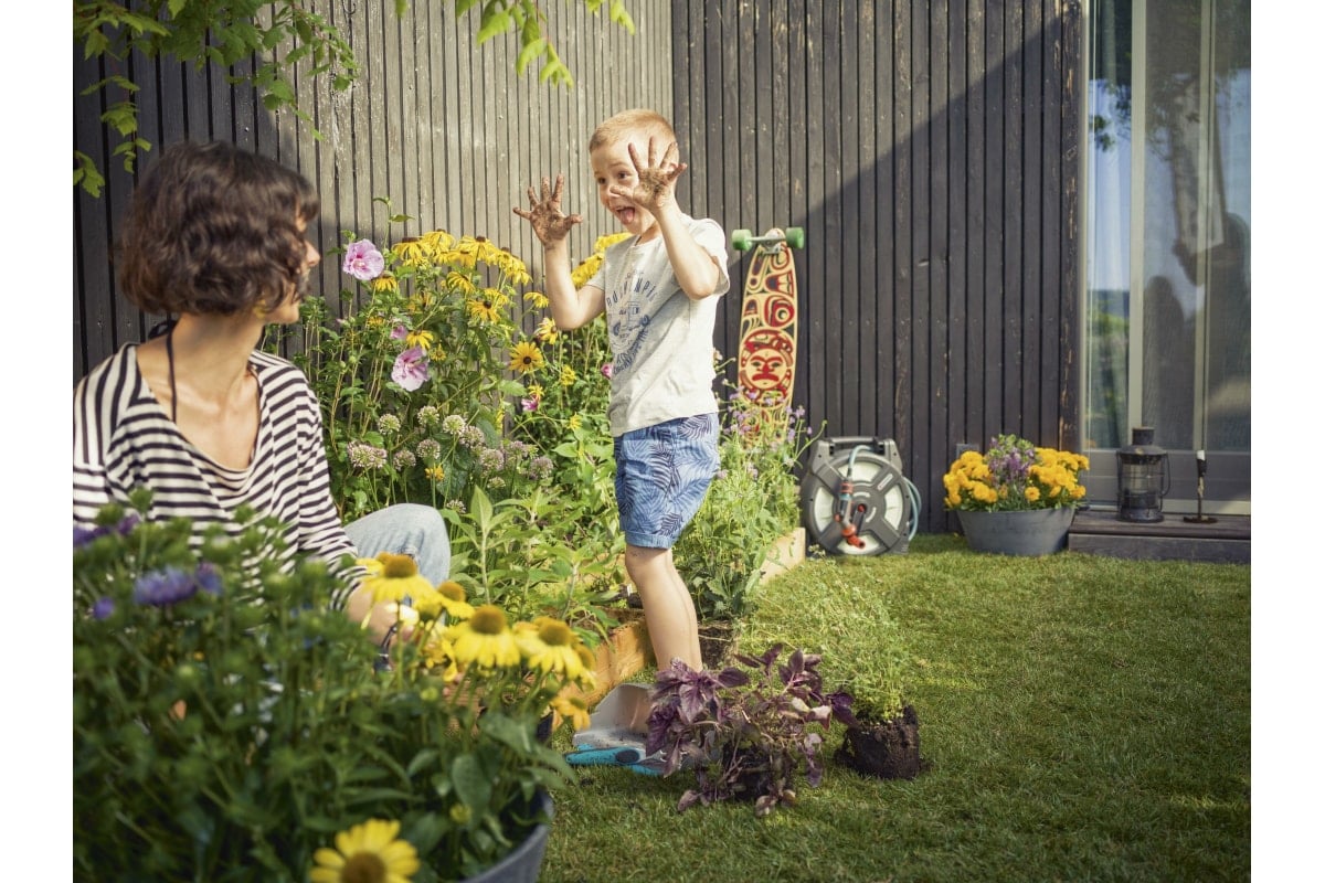 Высокопрочный шланг оснащен всеми необходимыми комплектующими системы полива GARDENA: соплом для очистки, комплект шланговых коробок готов к использованию.
