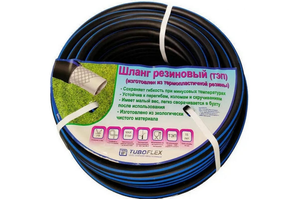 Поливочный резиновый шланг TUBOFLEX ТЭП, 1/2", 25 м ШПТЭП1225 используется не только для полива, но и для организации питьевого водоснабжения. Рабочее давление: 5 бар.