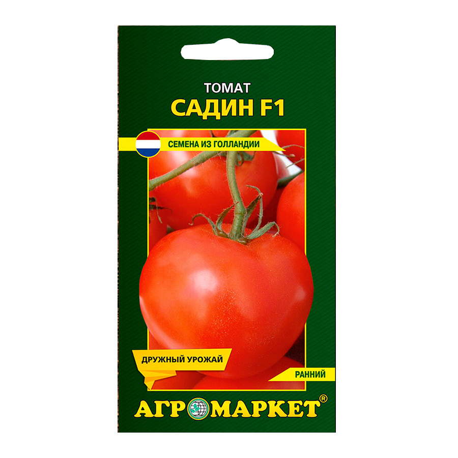 Томат Садин - ранний детерминантный гибрид голландской селекции. Плоды круглые, темно-красного цвета, выровненные, средним весом 180 г. Растение сильное, плоды надежно защищены от прямых солнечных лучей листьями. Предназначен для выращивания в открытом грунте и пленочных теплицах. Рекомендуется для цельноплодного консервирования и для употребления в свежем виде. Семена высевают в кассеты или в рассадные ящики. При температуре + 20-22 С всходы появляются на 5-7 день. При появлении 2-й пары настоящих листьев рассаду пикируют, пересаживая растения в отдельные горшочки. Можно рассаду высадить в открытый грунт, но при этом необходимо укрытие одновременно полиэтиленовой пленкой и спанбондом. В период роста рассаду необходимо регулярно подкармливать минеральными и органическими удобрениями. При высадке готовой рассады в поле в лунку добавляют комплексные удобрения и перепревший навоз.