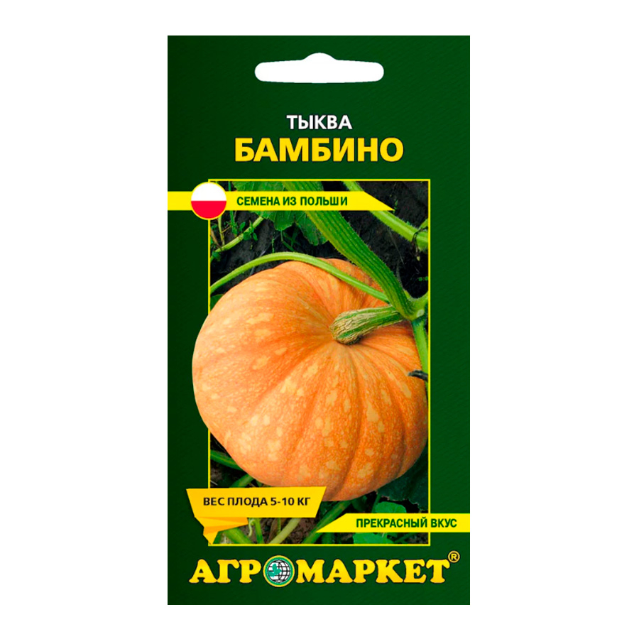 Тыква крупноплодная Бамбино относится к среднеранним сортам. Период от всходов до созревания составляет 100—110 дней. Растения мощные, длинноплетистые. Плоды округлой формы, слегка сплющенные, массой 5—10 кг. Мякоть лососево-оранжевая, нежная, с повышенным содержанием каротина, витаминов А и С, сладкая и сочная. Подходит для различной домашней кулинарии. Плоды хорошо хранятся в течение всей зимы.