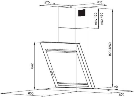 Настенная, наклонная кухонная вытяжка, ширина 60 см, тип очистки воздуха: рециркуляция, отвод, количество скоростей 3, макс производительность 620 м3/ч, кнопочное управление, металлический жироулавливающий фильтр, макс уровень шума 53 дБ.