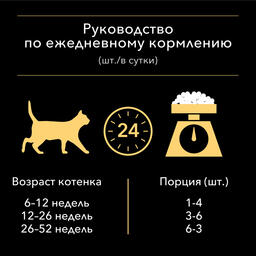 Рекомендации по кормлению: для котят от 6 до 12 недель требуется от 1 до 4 пакетиков корма в день; от 12 до 26 недель — от 2 до 5 пакетиков в день, от 26 до 52 недель — от 5 до 3 пакетиков в день, разделенных на два кормления или по желанию. Каждый котенок развивается по‐своему, поэтому количество корма и/или время кормления могут быть скорректированы в зависимости от уровня его активности и роста.