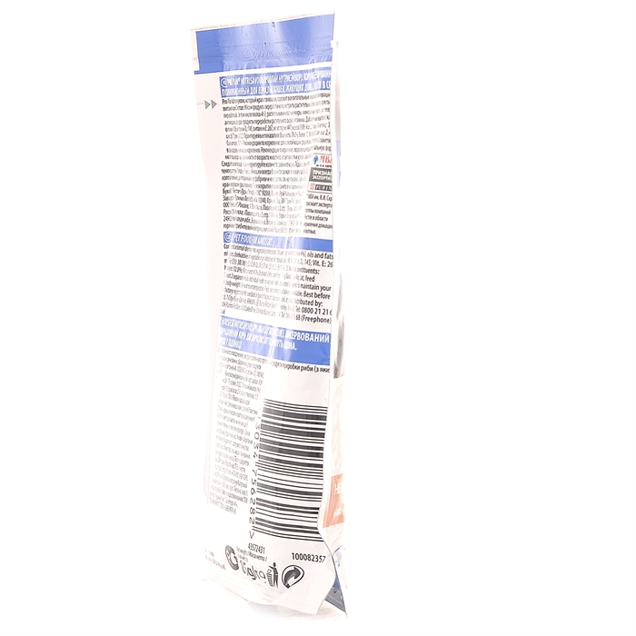 Ингредиенты: мясо и продукты переработки мяса, экстракты растительного белка, рыба и продукты переработки рыбы (в том числе лосось 4%), минеральные вещества, аминокислоты, целлюлоза, растительные масла и животные жиры, загустители, различные сахара, продукты переработки растительного сырья, красители, витамины.