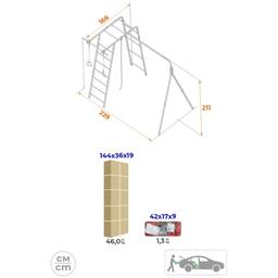 Толщина металла стоек: 1,5 ммСтрана происхождения: РоссияСпособ установки: цементируются «стаканы»Материал: металлВысота: 2,11 мЗанимаемая площадь: 2,29 х 1,66 мДиаметр трубы: 42 ммДиаметр ступени: 26 ммШирина ступени: 0,49 мШаг ступени: 0,26 мДопустимая нагрузка на навесное оборудование: 50 кгКомплектация: рукоход, турник, канат, кольца гимнастическиеДопустимая нагрузка: 100 кгВозрастная категория: 3+Вес комплекса: 47,3 кгУпаковка: картонная коробкаДопустимая нагрузка на турник: 100 кг