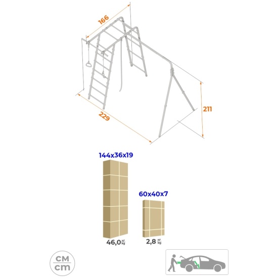 Толщина металла стоек: 1,5 ммСтрана происхождения: РоссияСпособ установки: цементируются «стаканы»Материал: металлВысота: 2,11 мЗанимаемая площадь: 2,29 х 1,66 мДиаметр трубы: 42 ммДиаметр ступени: 26 ммШирина ступени: 0,49 мШаг ступени: 0,26 мДопустимая нагрузка на навесное оборудование: 50 кгКомплектация: рукоход, турник, канат, кольца гимнастическиеДопустимая нагрузка: 100 кгВозрастная категория: 3+Вес комплекса: 48,8 кгУпаковка: картонная коробкаДопустимая нагрузка на турник: 100 кг