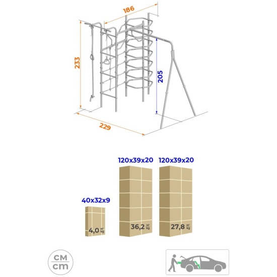 Толщина металла стоек: 1,5 ммТолщина металла качельной балки: 3,0 ммСтрана происхождения: РоссияСпособ установки: цементируются «стаканы»Материал: металлВысота: 2,33 мЗанимаемая площадь: 2,29 х 1,89 мДиаметр трубы: 42 ммДиаметр ступени: 26 ммШирина ступени: 0,49 мШаг ступени: 0,262 мДопустимая нагрузка на навесное оборудование: 50 кгКомплектация: кольца гимнастические, канатный лаз, канат, шведская стенка, турник, лаз круговой, качели цепныеДопустимая нагрузка: 100 кгВозрастная категория: 3+Вес комплекса: 68,5 кгУпаковка: картонная коробкаДопустимая нагрузка на турник: 100 кг