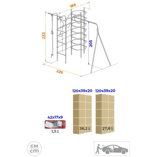 Толщина металла стоек: 1,5 ммТолщина металла качельной балки: 3,0 ммСтрана происхождения: РоссияСпособ установки: цементируются «стаканы»Материал: металлВысота: 2,33 мЗанимаемая площадь: 2,29 х 1,89 мДиаметр трубы: 42 ммДиаметр ступени: 26 ммШирина ступени: 0,49 мШаг ступени: 0,262 мДопустимая нагрузка на навесное оборудование: 50 кгКомплектация: кольца гимнастические, канатный лаз, канат, шведская стенка, турник, лаз круговой, качели пластиковыеДопустимая нагрузка: 100 кгВозрастная категория: 3+Вес комплекса: 65,3 кгУпаковка: картонная коробкаДопустимая нагрузка на турник: 100 кг