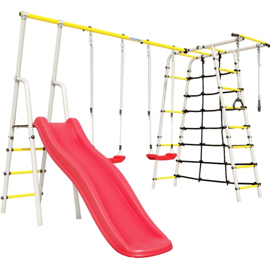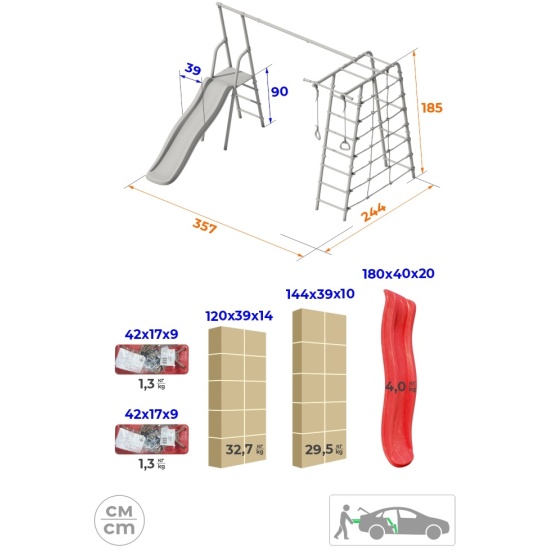 Толщина металла стоек: 1,5 ммСтрана происхождения: РоссияСпособ установки: цементируются «стаканы»Материал: металлВысота: 2,11 мЗанимаемая площадь: 3,15 х 2,37 мДиаметр трубы: 42 ммДиаметр ступени: 25 ммШирина ступени: 0,49 мШаг ступени: 0,26 м (0,3 на наклонной)Длина горки: 1,8 мДопустимая нагрузка на навесное оборудование: 50 кгКомплектация: горка, кольца гимнастические, веревочный лаз, шведская стенка, рукоход турникДопустимая нагрузка: 100 кгВозрастная категория: 3+Вес комплекса: 64,6 кгУпаковка: картонная коробкаДопустимая нагрузка на турник: 100 кг