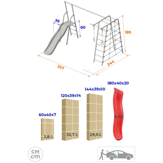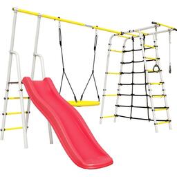 Толщина металла стоек: 1,5 ммСтрана происхождения: РоссияСпособ установки: цементируются «стаканы»Материал: металлВысота: 2,11 мЗанимаемая площадь: 3,15 х 2,37 мДиаметр трубы: 42 ммДиаметр ступени: 25 ммШирина ступени: 0,49 мШаг ступени: 0,26 м (0,3 на наклонной)Длина горки: 1,8 мДопустимая нагрузка на навесное оборудование: 50 кгКомплектация: горка, кольца гимнастические, веревочный лаз, шведская стенка, рукоход турникДопустимая нагрузка: 100 кгВозрастная категория: 3+Вес комплекса: 64,8 кгУпаковка: картонная коробкаДопустимая нагрузка на турник: 100 кг