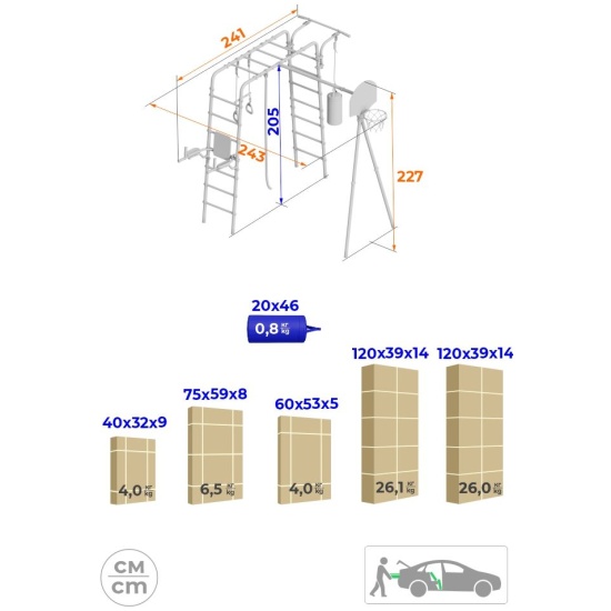 Толщина металла стоек: 1,5 ммТолщина металла качельной балки: 3,0 ммСтрана происхождения: РоссияСпособ установки: цементируются «стаканы»Материал: металлВысота: 2,27 мЗанимаемая площадь: 2,44 х 2,38 мДиаметр трубы: 42 ммДиаметр ступени: 26 ммШирина ступени: 0,49 мШаг ступени: 0,262 мДопустимая нагрузка на навесное оборудование: 50 кгКомплектация: турник, баскетбольный щит, перекладина, брусья, кольца с перекладиной, груша боксерская, качели цепныеДопустимая нагрузка: 100 кгВозрастная категория: 3+Вес комплекса: 67,1 кгУпаковка: картонная коробкаДопустимая нагрузка на турник: 100 кг