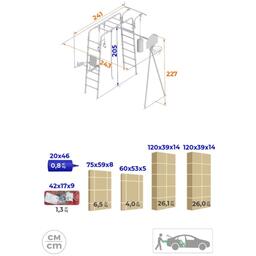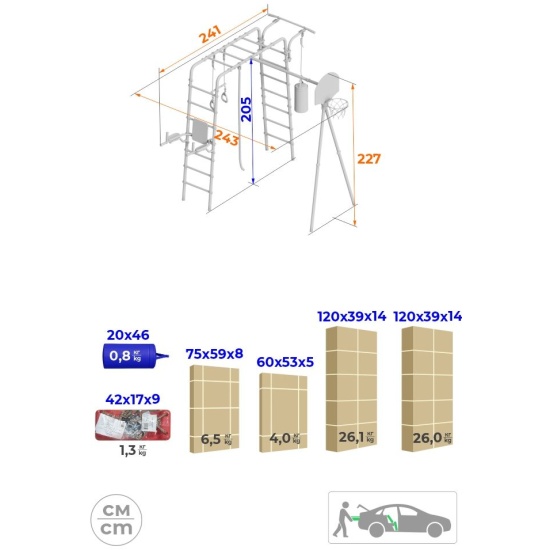 Толщина металла стоек: 1,5 ммТолщина металла качельной балки: 3,0 ммСтрана происхождения: РоссияСпособ установки: цементируются «стаканы»Материал: металлВысота: 2,27 мЗанимаемая площадь: 2,44 х 2,38 мДиаметр трубы: 42 ммДиаметр ступени: 26 ммШирина ступени: 0,49 мШаг ступени: 0,262 мДопустимая нагрузка на навесное оборудование: 50 кгКомплектация: турник, баскетбольный щит, перекладина, брусья, кольца с перекладиной, груша боксерская, качели пластиковыеДопустимая нагрузка: 100 кгВозрастная категория: 3+Вес комплекса: 64,4 кгУпаковка: картонная коробкаДопустимая нагрузка на турник: 100 кг