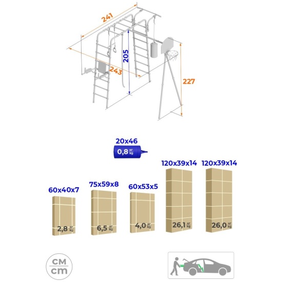 Толщина металла стоек: 1,5 ммТолщина металла качельной балки: 3,0 ммСтрана происхождения: РоссияСпособ установки: цементируются «стаканы»Материал: металлВысота: 2,27 мЗанимаемая площадь: 2,44 х 2,38 мДиаметр трубы: 42 ммДиаметр ступени: 26 ммШирина ступени: 0,49 мШаг ступени: 0,262 мДопустимая нагрузка на навесное оборудование: 50 кгКомплектация: турник, баскетбольный щит, перекладина, брусья, кольца с перекладиной, груша боксерская, качели гнездоДопустимая нагрузка: 100 кгВозрастная категория: 3+Вес комплекса: 65,9 кгУпаковка: картонная коробкаДопустимая нагрузка на турник: 100 кг