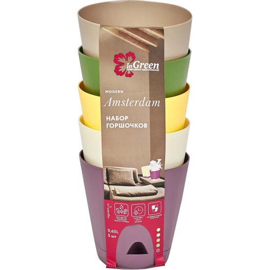 Набор горшочков для цветов AMSTERDAM D110мм / 0,65л с прикорневым поливом 5шт. микс INGREEN ING6217МИКС