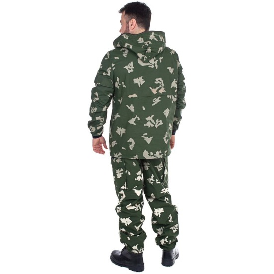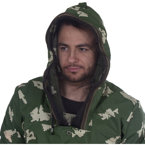 Состоит из куртки и брюк. Куртка с капюшоном и противомоскитной сеткой, убираемой в потайной нагрудный карман. Костюм дополнительно оснащен противоклещевыми ловушками.
