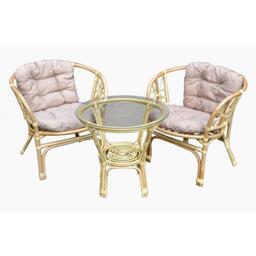Габариты элементов (ШхГ/ДхВ) : стол: 600х600х550кресло: 680х630х730Цвет каркаса : медовыйМатериал каркаса : ротанг натуральныйЦвет чехла мягкого элемента/матраса : бежевыйУзор ткани : без рисункаМатериал чехла мягкого элемента : полиэстер+хлопокТолщина мягкого элемента : 6Цвет поверхности : медовыйМатериал поверхности : ротанг натуральный, стеклоКомплектация : стол, 2 кресла