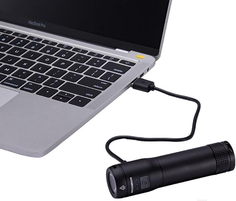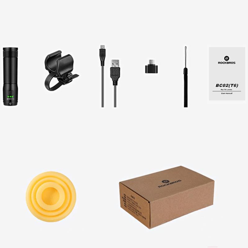 • В наборе крепление, кабель USB, фонарь, инструкция, насадка (силиконовая), переходник, ремешок на руку