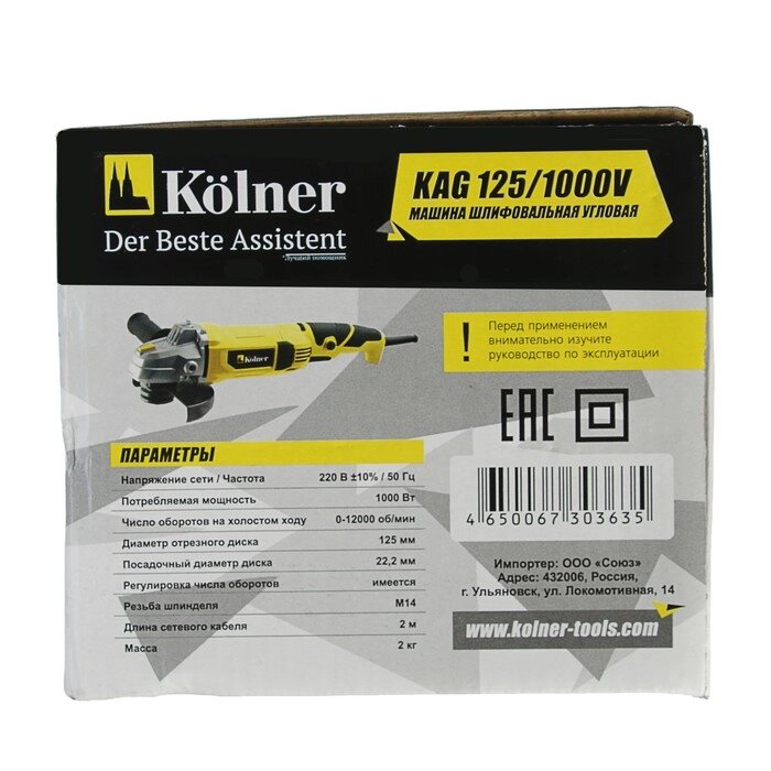 Угловая шлифмашина Kolner KAG 125/1000 V, 1000 Вт, d=125х22.2 мм, регулировка числа оборотов