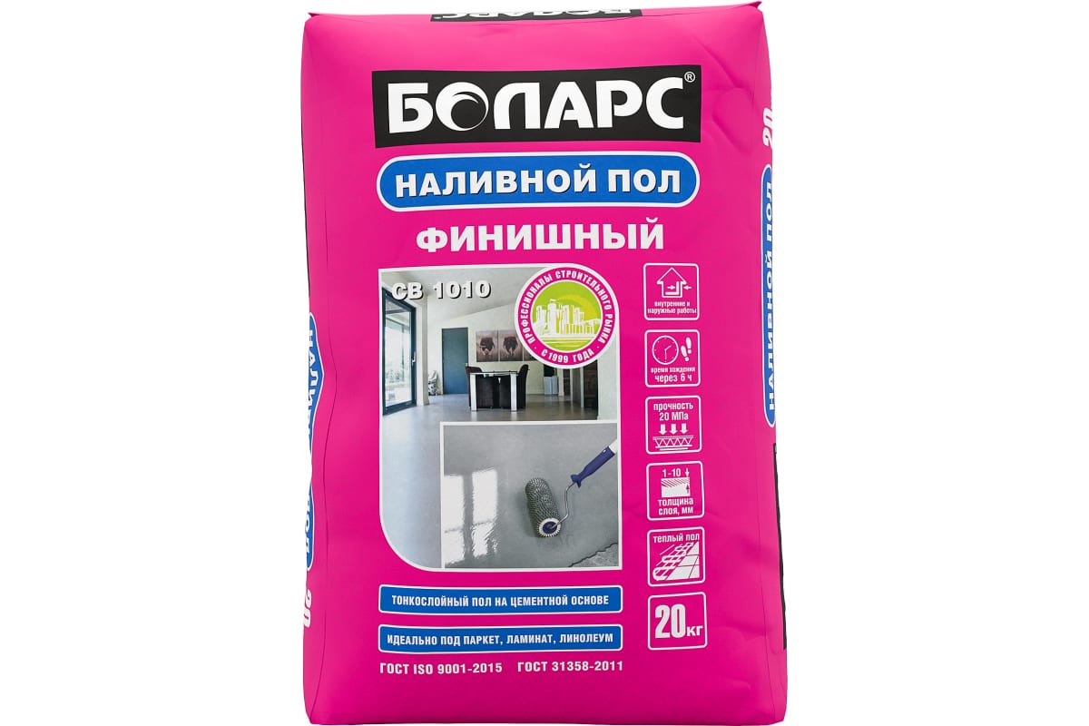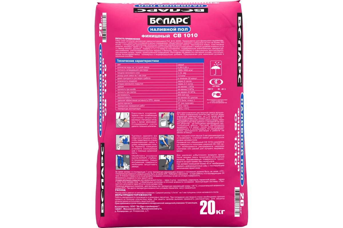 Самовыравнивающийся пол БОЛАРС СВ-1010 20 кг 00000022366 финишный наливной пол применяется для выравнивания бетонных полов и цементных стяжек в жилых помещениях, общественных зданиях с нагрузкой на пол не более 200 кг/кв. см, с последующим креплением напольных покрытий (керамическая плитка, текстильные ковры, пластиковые покрытия, линолеум, паркет и др.).