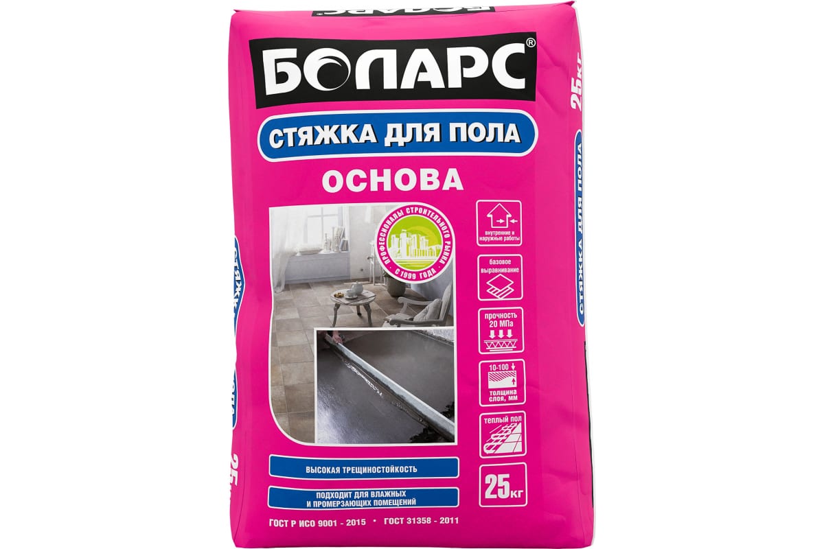 Основа-стяжка для пола БОЛАРС 25 кг 00000014814 предназначена для базового выравнивания поверхностей и создания уклонов слоем 10-100 мм под последующее нанесение наливных полов и крепление напольных покрытий с нагрузкой на поверхность не более 200 кг/кв. см.