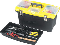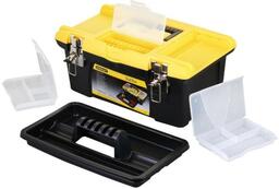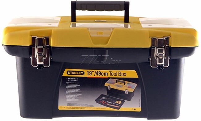 Ящик для инструмента пластмассовый STANLEY 19" Jumbo (1-92-906) - ящик для инструмента с диагональю 19 дюймов и габаритами 486х276х232 мм. Язик изготовлен из пластмассы и оснащен 2 съемными органайзерами на крышке для хранения крепежа и оснастки, для удобного размещения отверток предусмотрены боковые вставки. Замки у ящика выполнены из металла. Удобная ручка облегчает переноску ящика.