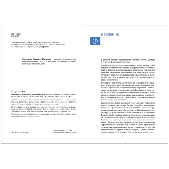 Пособие издано в рамках учебно-методического комплекта к программе «ОТ РОЖДЕНИЯ ДО ШКОЛЫ». В пособии представлена методика и конспекты занятий по физическому воспитанию детей 6-7 лет. Книга содержит: • методические рекомендации по работе с детьми 6-7 лет; • примерное содержание физкультурных занятий. Материалы пособия четко структурированы, ход занятий подробно прописан, учитывая возрастные возможности детей, что позволяет успешно проводить занятия с детьми не только опытным педагогам, но и начинающим специалистам. Количество конспектов рассчитано на проведение трех занятий в неделю, одно из которых организуется на улице.
