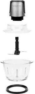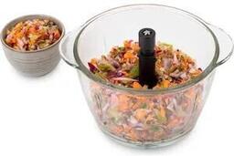 Измельчитель мощностью 300 Вт. Стеклянная чаша объемом 1 л. Нож с 2-мя лезвиями. Прорезиненная подставка. Чашу и нож можно мыть в ПММ.