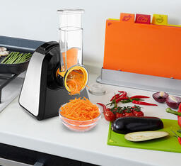 Мощность 150 Вт, количество скоростей 1, в комплекте: диск для картофеля-фри, тёрка, тёрка для драников, диски для шинковки, нарезка ломтиками.