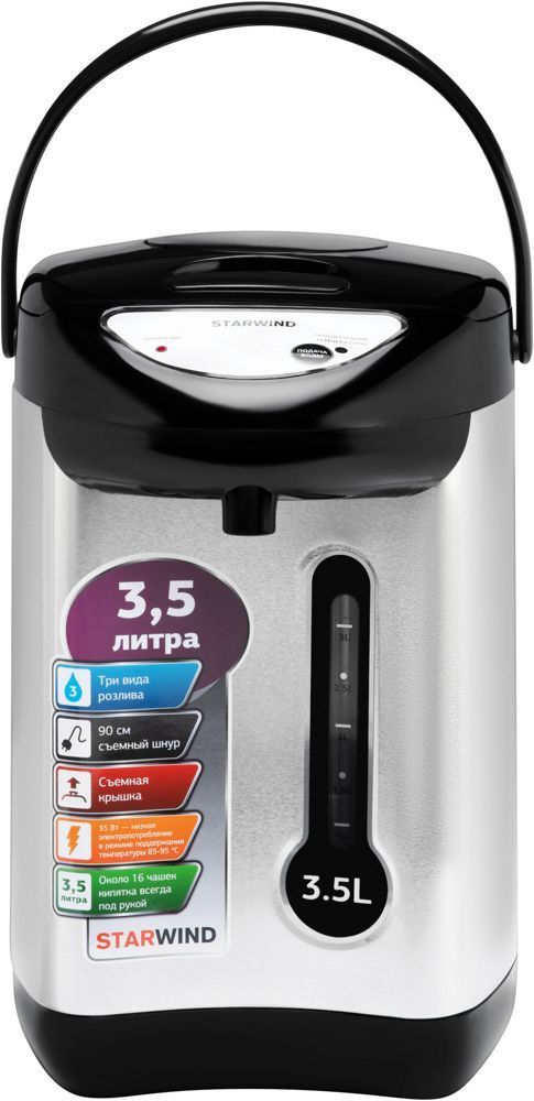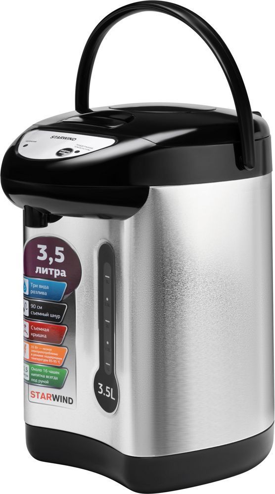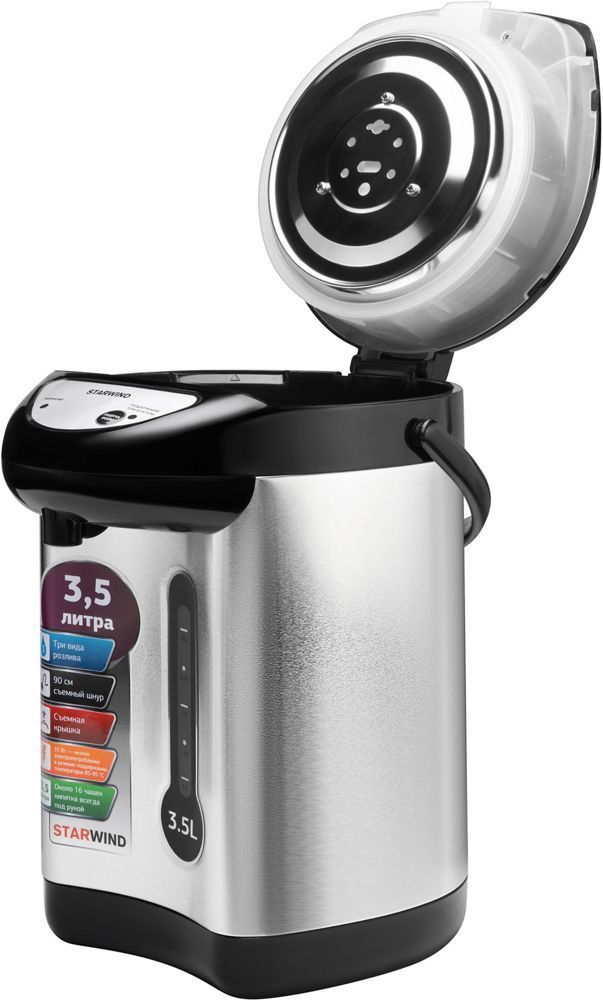 Объем 3.5 л, мощность 750 Вт, режим подачи воды: электрический, помповый, нажатием чашкой, тип нагревательного элемента закрытая спираль, материал корпуса металл.