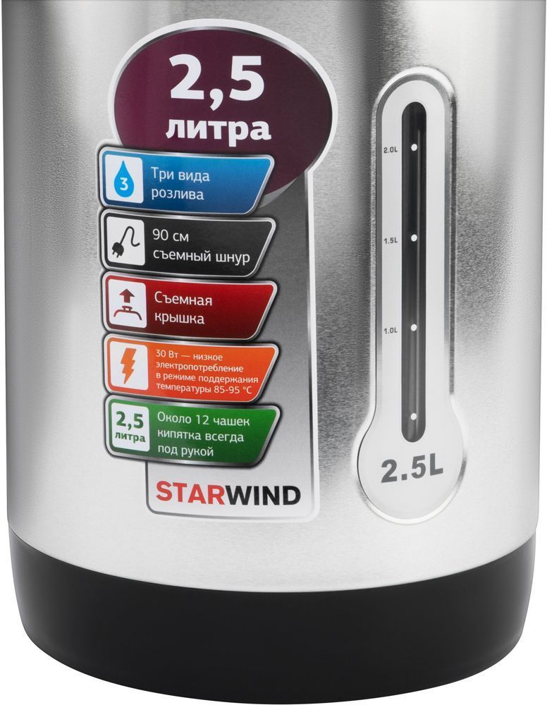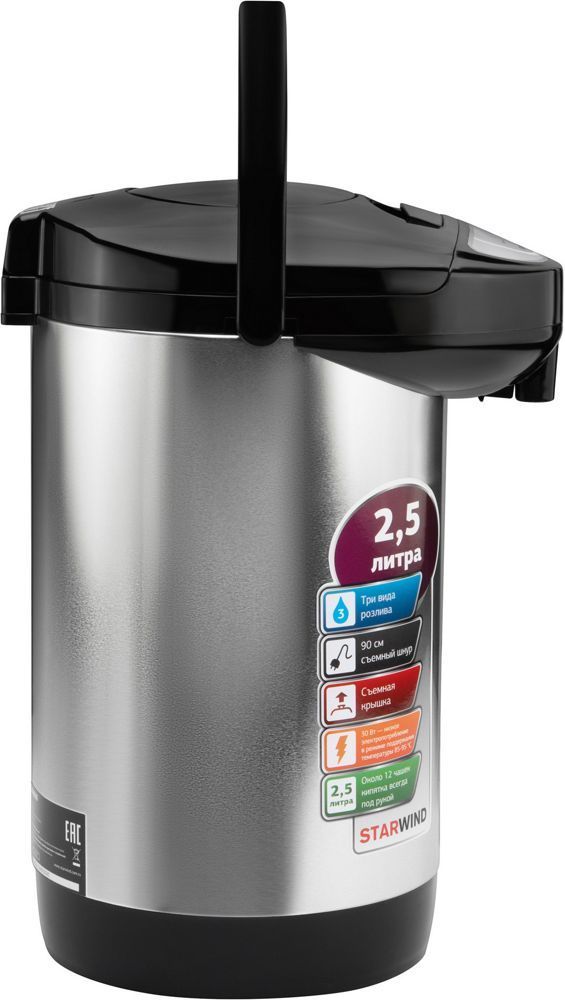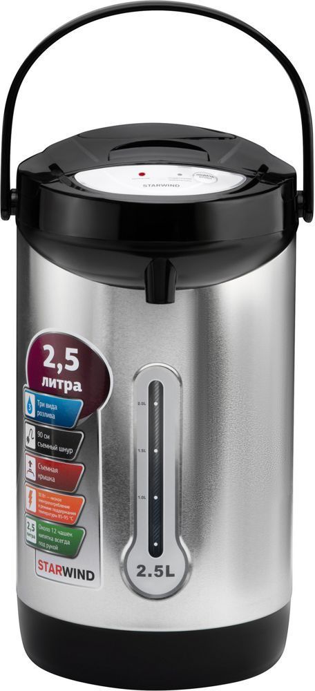 Объем 2.5 л, мощность 600 Вт, режим подачи воды: электрический, помповый, нажатием чашкой, тип нагревательного элемента закрытая спираль, материал корпуса металл.