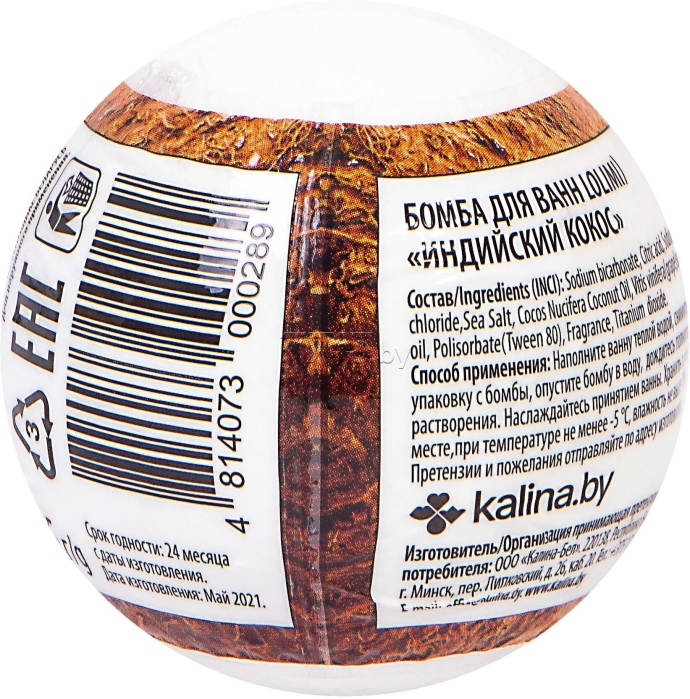 Бурлящий шар для ванны LOLIMI) Индийский кокос 135 г (4814073000289) – это замечательное средство, которое способно в разы усилить пользу и удовольствие от принятия ванны. В составе этого маленького чуда много ингредиентов и эфирных масел, которые смягчают воду. Бомбы для ванн произведенные в Беларуси LOLIMI) дополнительно смягчают и увлажняют кожу, оказывают антибактериальное и успокаивающее действие.