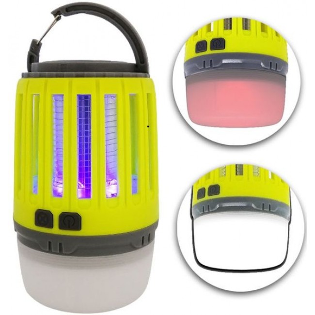 Фонарь совмещает в себе сразу 2 прибора: кемпинговый фонарь и уничтожитель насекомых. Предназначен для использования на улице и в помещении. Прибор привлекает насекомых УФ свечением и мгновенно убивает их, воздействуя маломощными электрическими разрядами, которые для человека не представляют опасности. Заряжается от сети 220 В, ноутбука, powerbank и любых других устройств, на которых есть USB порт. От аккумулятора устройство работает до 20 часов.