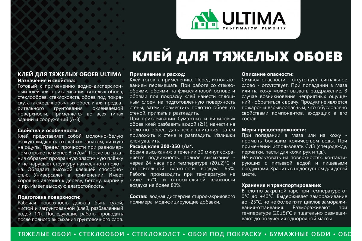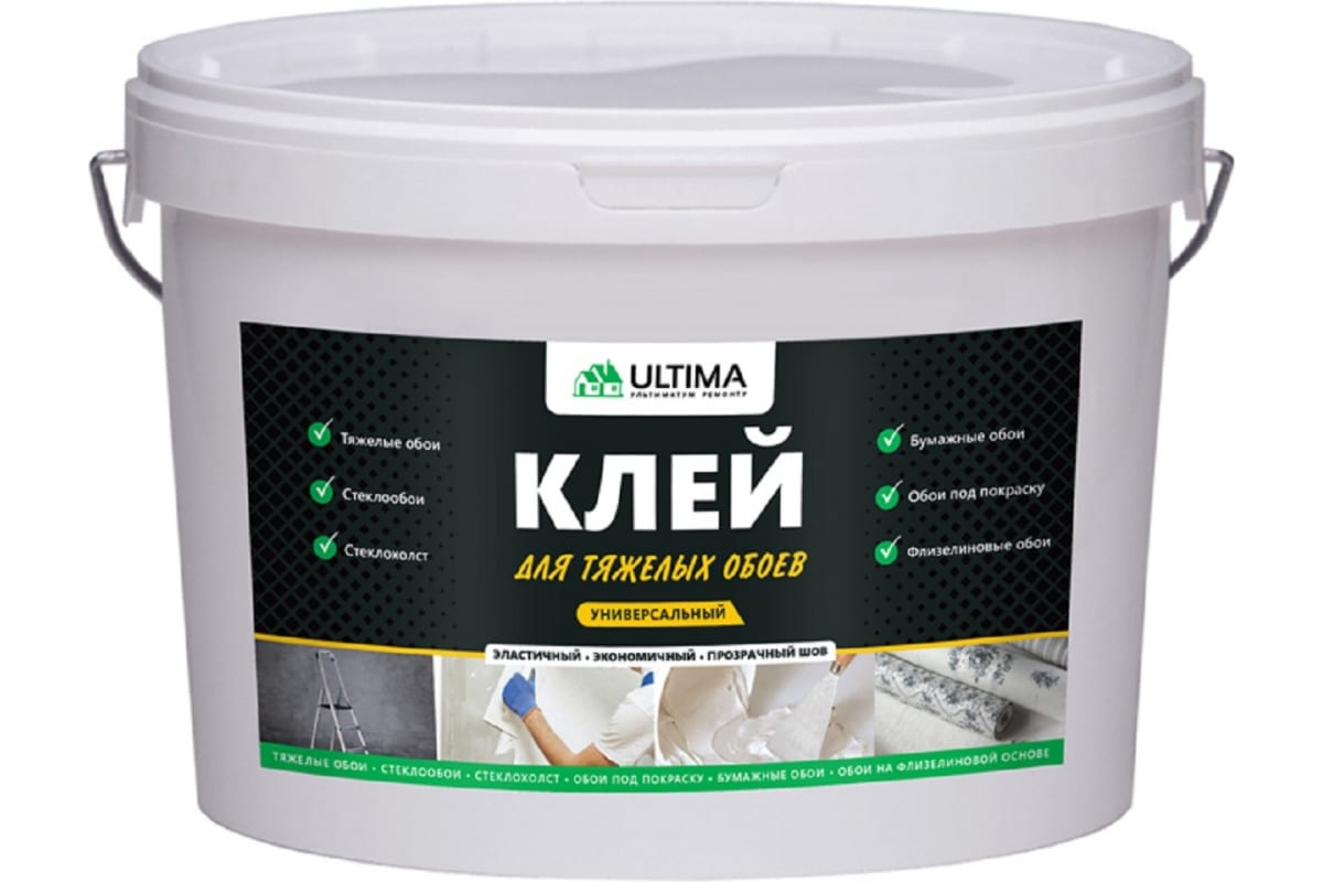 Обойный клей для флизелиновых и бумажных обоев ULTIMA 10 кг ULTAWP10 - готовый к применению водно-дисперсионный клей для приклеивания тяжелых обоев, стеклообоев, стеклохолста, обоев под покраску, а также для обычных обоев и для предварительного грунтования оклеиваемой поверхности.