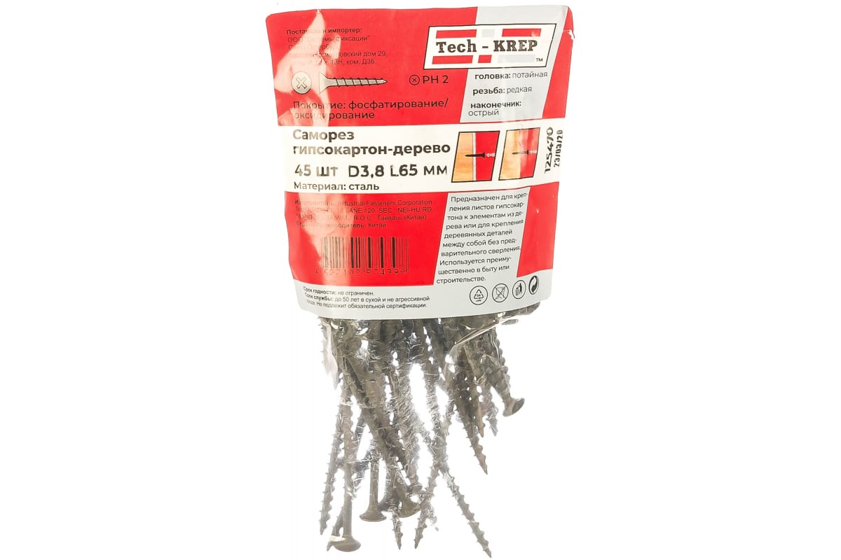 Саморезы гипсокартон-дерево 3.8х65, 45шт - пакет Tech-Krep 125470