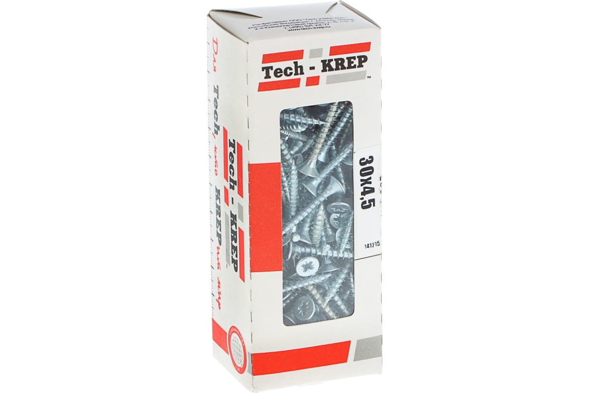 Универсальный саморез Tech-Krep 30х4,5 мм 200 шт оцинкованный, коробка с окном 102189 изготовлен из углеродистой стали с антикоррозионным цинковым покрытием, имеет потайную головку с крестообразным шлицем PZ, крупную накатанную резьбу и острый наконечник.