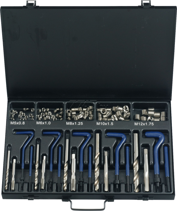 Набор для восстановления резьбы FORCE 130 предметов (9130U1) - профессиональный набор для восстановления резьбы М5-М12. Сверла и метчики изготовлены из быстрорежущей стали HSS. Одноступенчатые метчики нарезают резьбу, в которую вставляется спираль из нержавеющей стали SUS304. Набор рассчитан на 5 типов резьбы: M5x0,8 мм, M6x1 мм, M8x1,25 мм, M10x1,5 мм, M12x1,75 мм.
