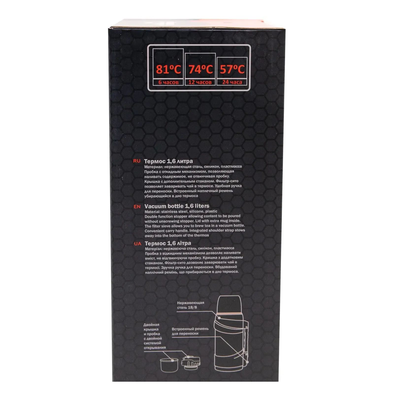 Пробка термоса має фільтр-сито для того, щоб було комфортно пити чай, заварений безпосередньо всередині термоса. Фільтр легко знімається для миття.