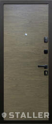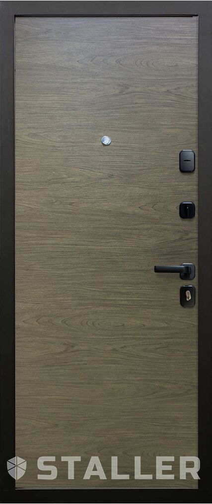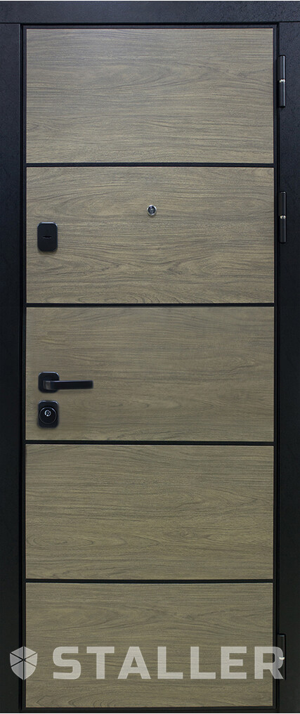 Современный образ модерна, древесная текстура МДФ полотен, металлические горизонтальные вставки на внешней панели – все это делает образ входной двери «Торонто» лаконичным и стильным. Сложный цилиндр с поворотной ручкой и ночной замок помогают надежно защищать ваше жилое помещение от взлома. Можете не беспокоится о внешних воздействиях и износостойкости модели – покрытие полотен устойчиво к воздействию влаги, температурным перепадам и не привередливо в уходе.