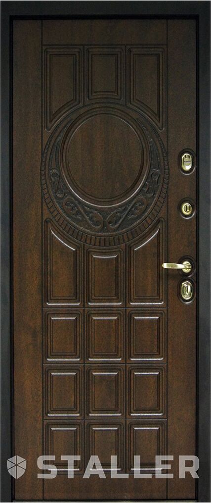 Художественные объемные фрезеровки на влагостойких МДФ полотнах создают невероятно изящный образ уличной входной двери «Аплот», что выгодно выделит ваш дом среди остальных. Для мягкого закрывания двери в период всего срока службы, в конструкции присутствует регулятор притвора. В качестве утеплителя используется экологичная минеральная вата KNAUF, обладающая высокой звукоизоляцией, шумоизоляцией и огнеупорностью.
