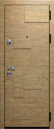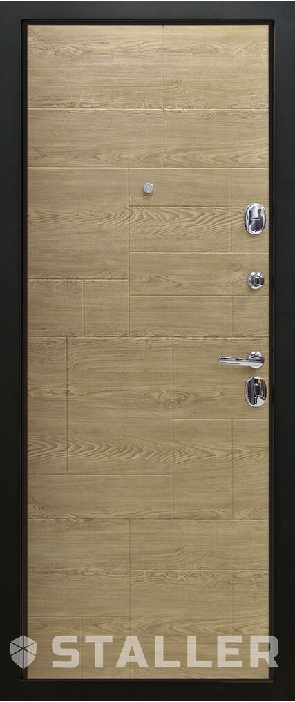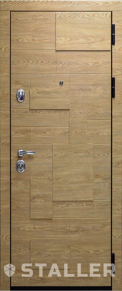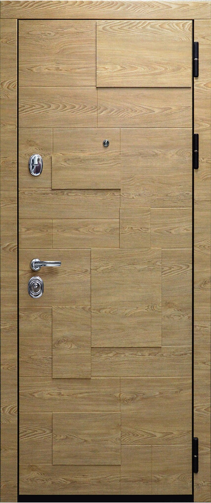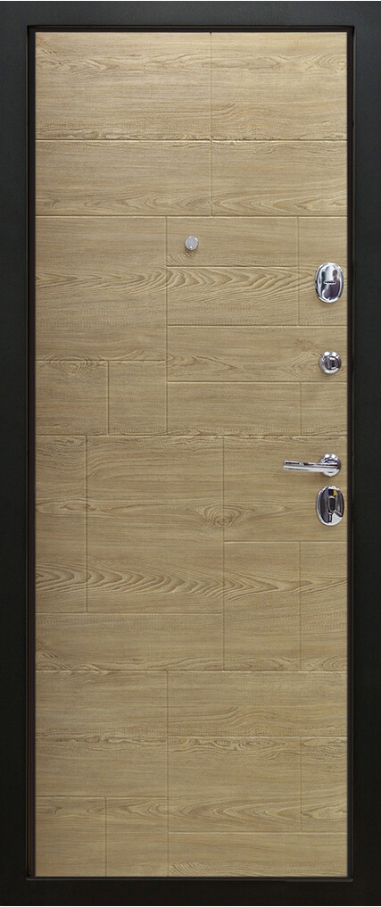 За счет выступающих элементов наружная панель выглядит очень стильно. Внутренняя хорошо сочетается с межкомнатными дверями.