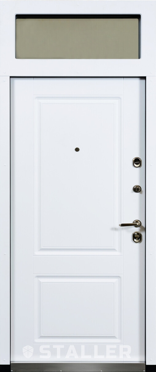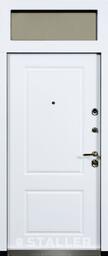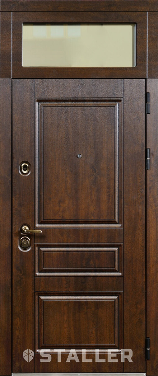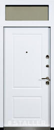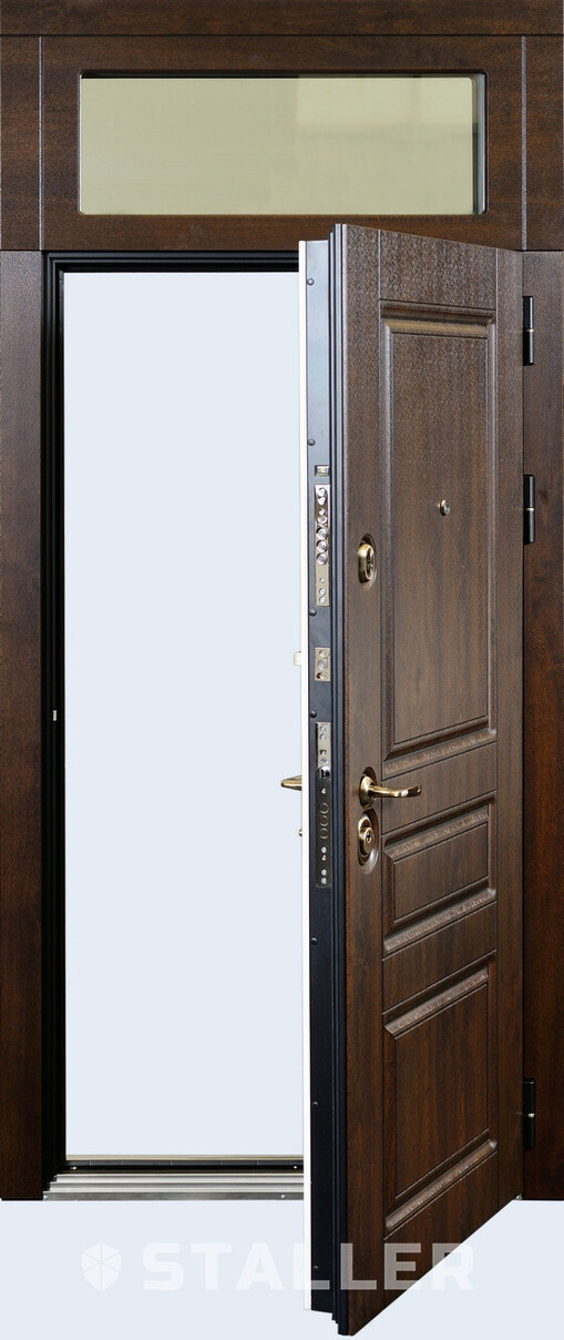 Наружный щит: Фрезеровка П-2, фрамуга с индивидуальным стеклопакетом. Покрытие: Винорит дуб тёмный + патина чёрная. Внутренний щит: Фрезеровка П-2. Покрытие: Винорит белый.