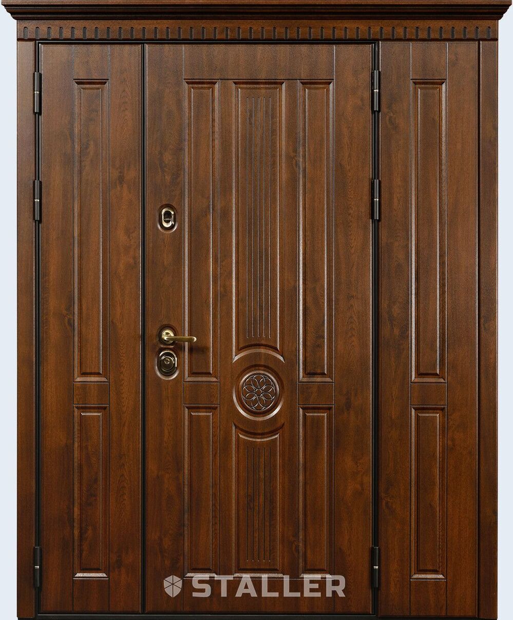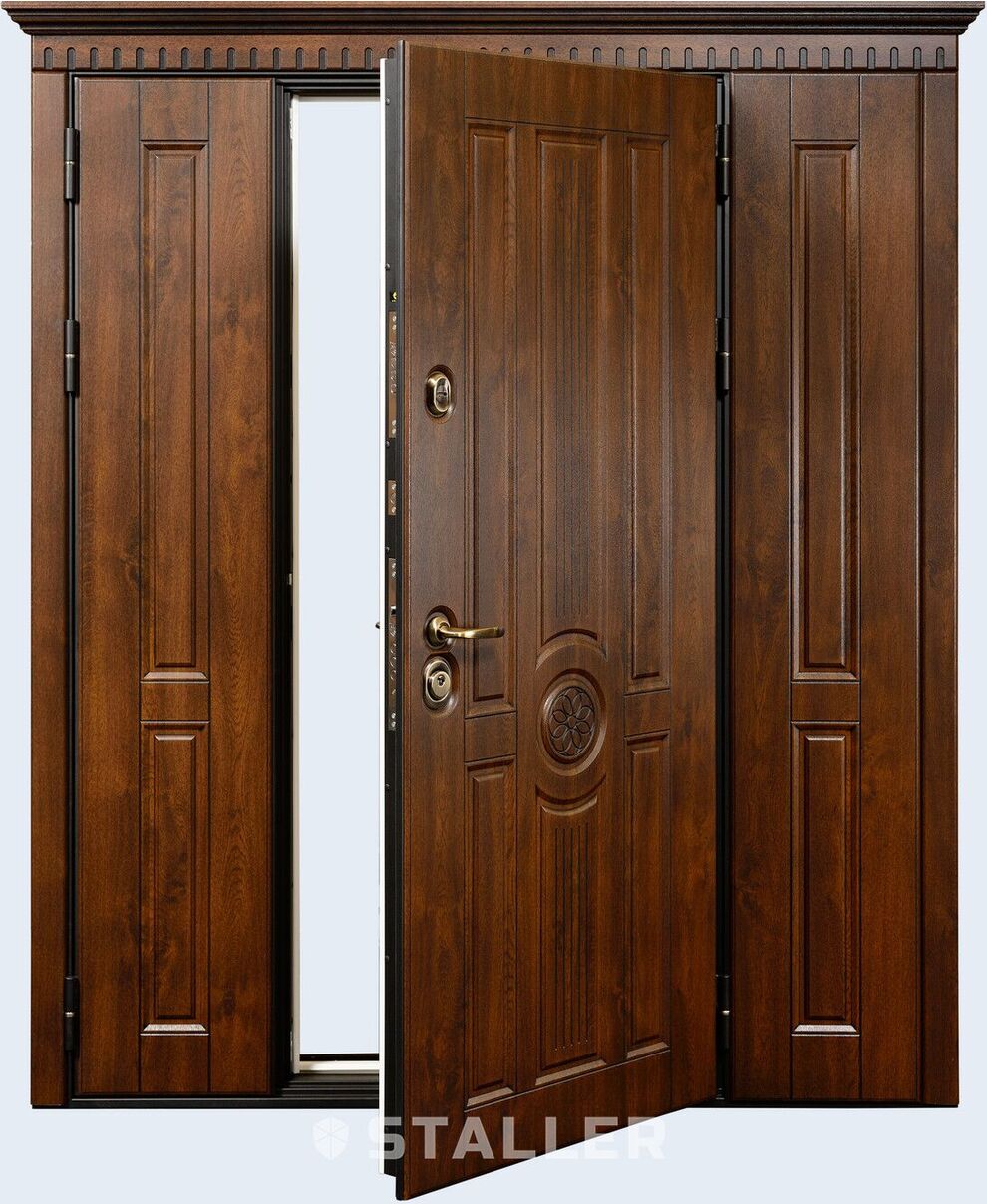 Двустворчатая модель с дополнительной створкой (фрамугой). Наличник Бьянко. Наружный щит: Фрезеровка П-62. Покрытие: Винорит Дуб тёмный + патина чёрная.