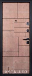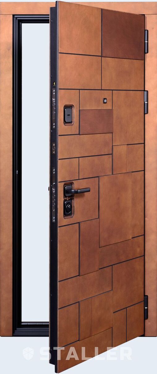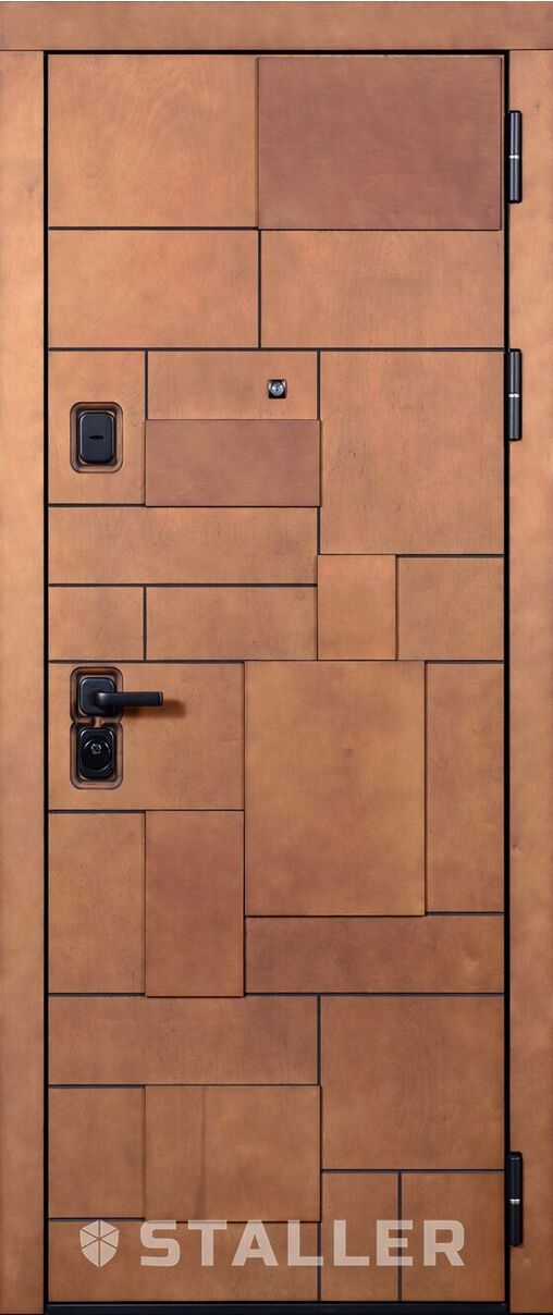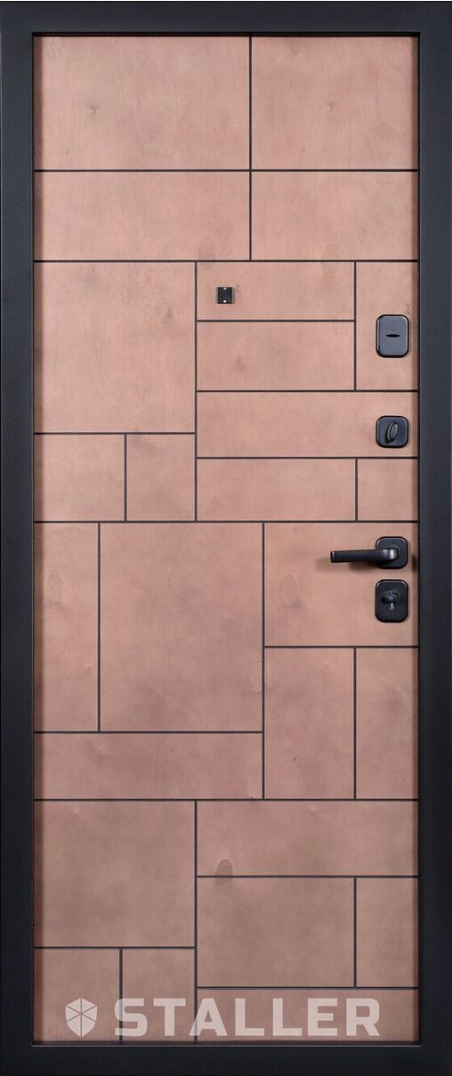 Стильная входная дверь на базе модели «Бруно» выполнена под заказ. В качестве отделки панелей с декоративной геометрической фрезеровкой используется березовая ФСФ фанера в цветах Орех/ Дуб шато. Такой материал обладает повышенной прочностью и устойчив к воздействию влаги, что обеспечивает сохранность презентабельного внешнего вида модели на несколько десятилетий.
