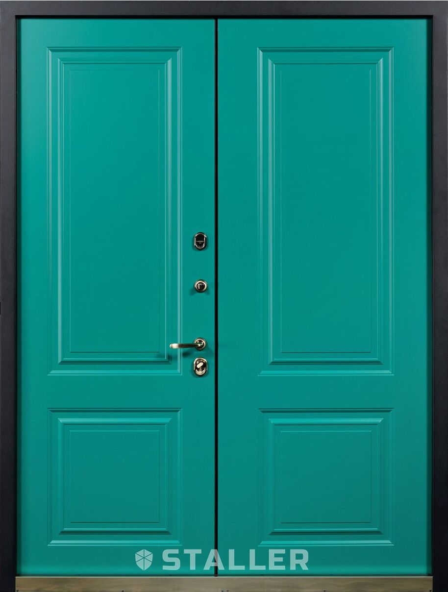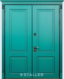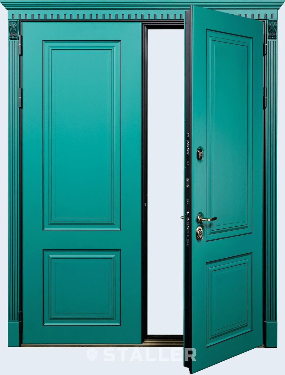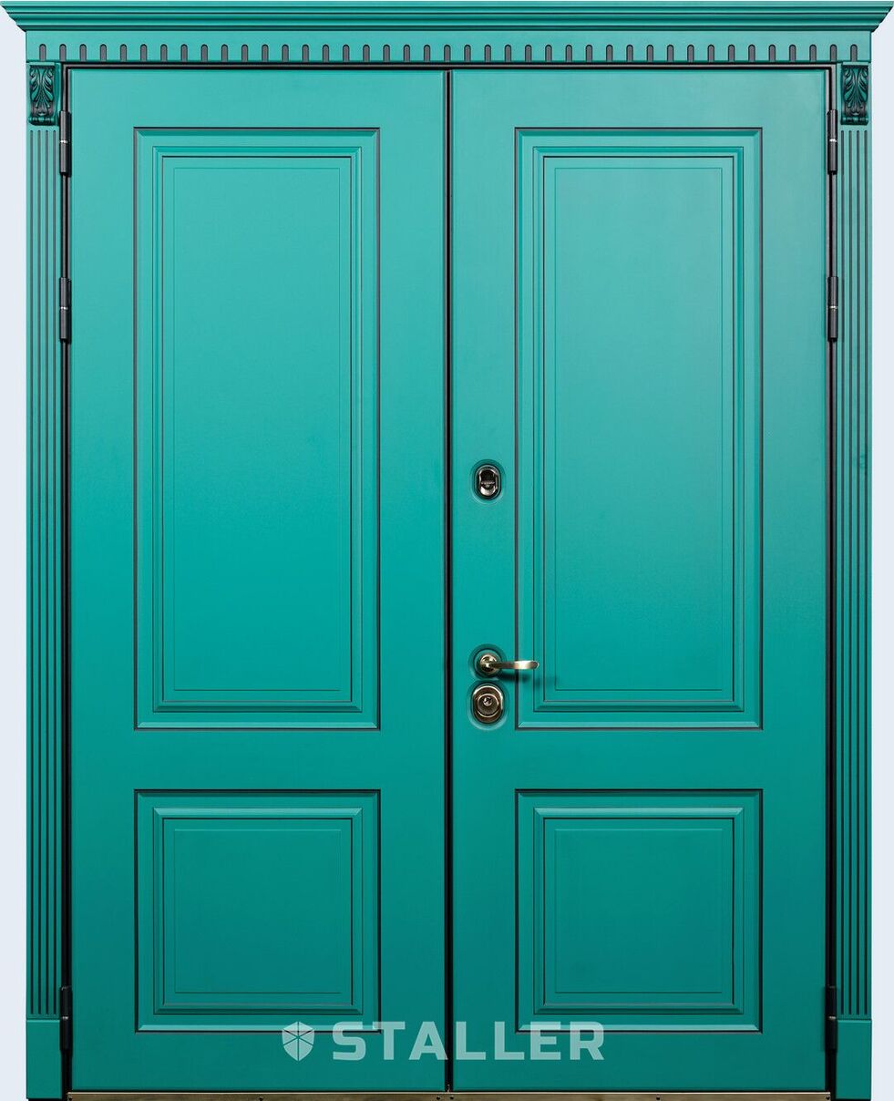 Двустворчатая модель с наличником Бьянко Зевс. Наружный щит: Фрезеровка ВБ-1. Покрытие: Эмаль RAL 5018 + чёрная патина. Внутренний щит: ВБ-1. Покрытие: RAL5018.