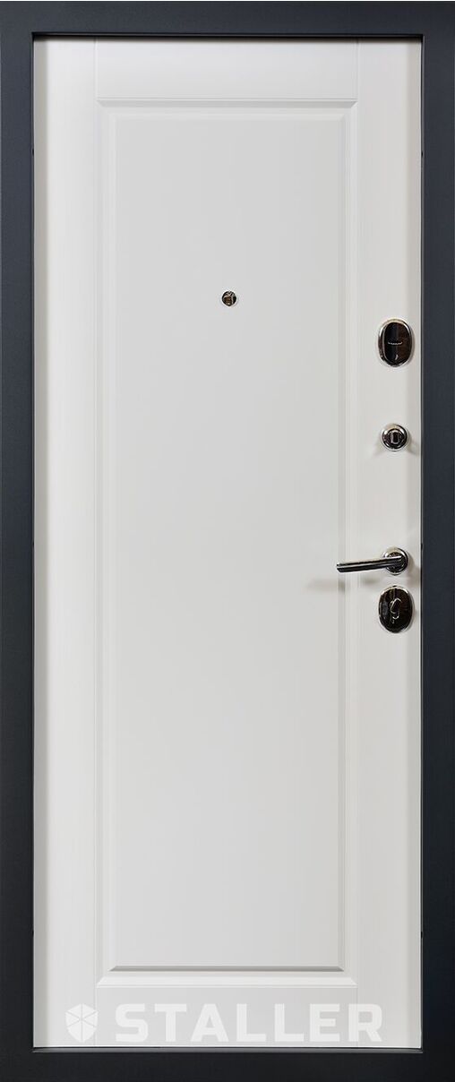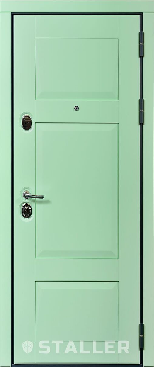 Наружный щит: Фрезеровка HB-5. Покрытие: Эмаль RAL 6021. Внутренний щит: П-30. Покрытие: ПВХ Шагрень белая.