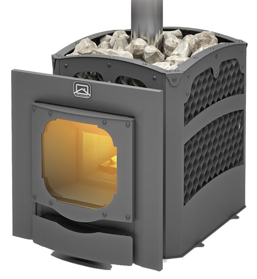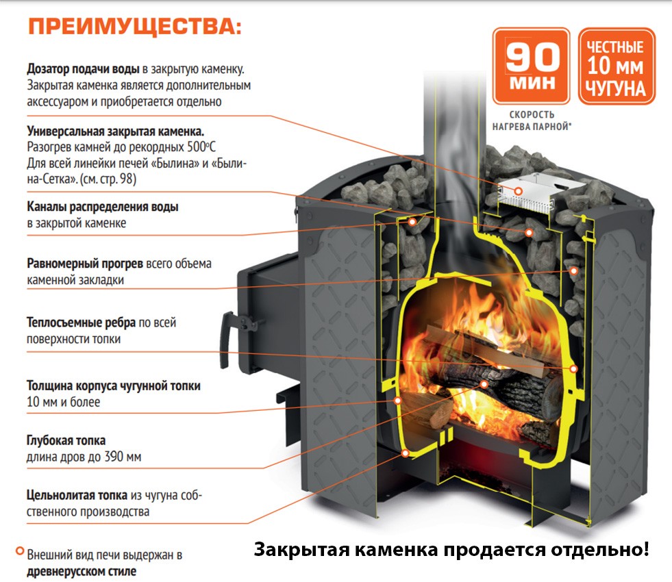 Еще одной отличительной особенностью печи, без сомнений, стала максимально возможная площадь теплообмена за счет большого количества конвекционных ребер чугунной топки. Да и округлая форма самой топки сконструирована так, чтобы прогревать весь объем каменной закладки без застойных «холодных» зон. В результате имеем максимально жесткую и действительно прочную печь. Нагревайте парную быстро, парьтесь по-богатырски! Выверенная конструкция печи позволяет равномерно прогреть не только парную, но и мойку, и комнату отдыха. Печь «Былина» рассчитана на парную объемом до 24 м 3 . Диаметр дымохода 115 мм. На печь можно установить любые стандартные элементы дымохода. Гарантийный срок 3 года.