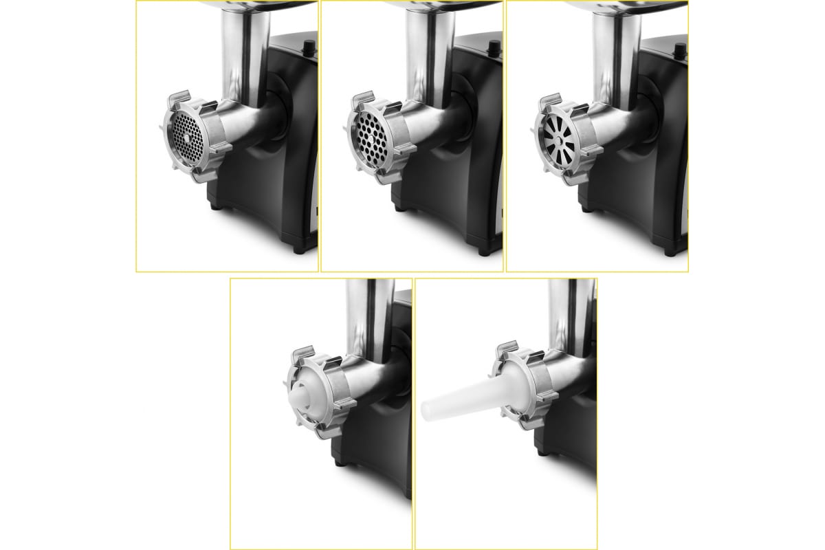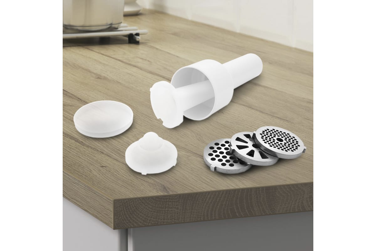 В комплект входят решётки для фарша разного диаметра 4, 7 мм и решётка с крупными отверстиями, которые позволят сделать как котлеты и бифштексы, так и нежнейшие фрикадельки, например, для детского питания.