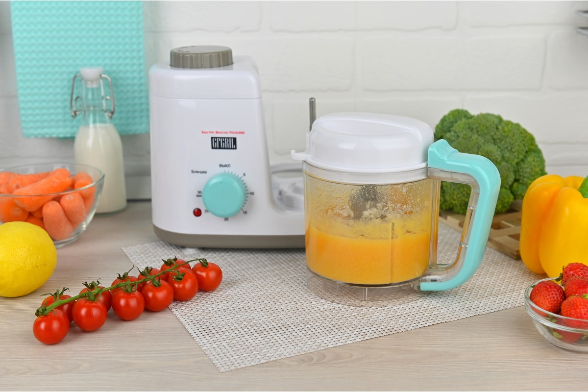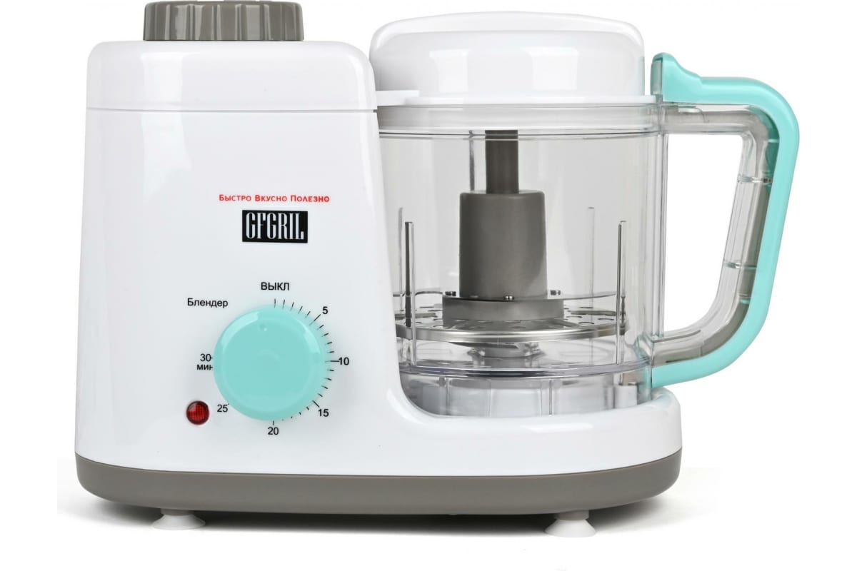 Пароварка-блендер GFGRIL GFSB-4 предназначена для быстрого и простого приготовления натурального пюре из различных продуктов в одной емкости. Уникальная конструкция позволяет разместить в кувшине объемом 750 мл одновременно и металлическую решетку для приготовления на пару, и лезвия блендера для измельчения продуктов, что упрощает весь процесс приготовления. Больше не нужно перекладывать приготовленные на пару продукты в кувшин блендера, а достаточно одним движением поворотного регулятора запустить приготовление пюре. Фрукты, овощи, мясо и рыба за короткое время готовятся на пару, сохраняя максимум полезных свойств, а 4 острых стальных лезвия измельчают продукты, создавая полезное пюре нежной однородной консистенции. Пароварка-блендер будет незаменимым помощником для родителей. А компактные размеры и легкий вес позволят с легкостью брать ее с собой в поездку и готовить вкусное натуральное пюре где угодно. Таймер от 1 до 30 мин. Мощность 450 Вт.