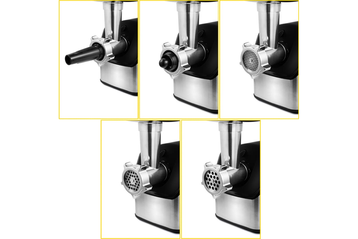 В комплект входят решётки для фарша разного диаметра 3, 5 и 7 мм, которые позволят сделать как котлеты и бифштексы, так и нежнейшие фрикадельки, например, для детского питания.
