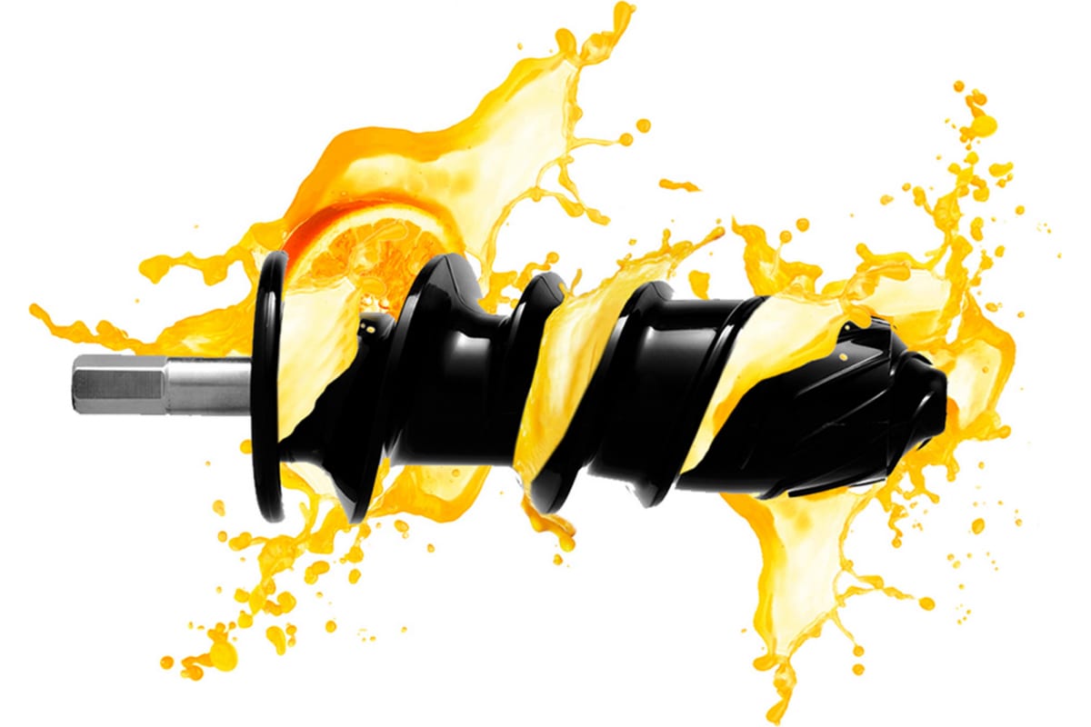 Ультрапрочный спиралевидный шнек-пресс захватывает, дробит и прессует плоды, подающиеся к нему через загрузочный лоток в считанные секунды!