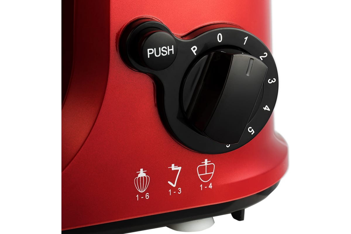 Миксер оснащён вместительной чашей 4л. Форма насадок и чаши подобраны так, что при любом количестве продуктов насадка не оставляет их по краям не перемешанными.